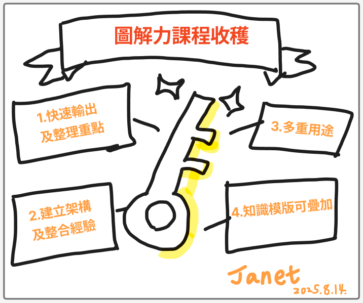 以前只用文字寫課程筆記,時常需要花很多時間整理。現在藉由知識圖解, 再經由腦中的構想,先萃取出大方向的重點摘要,再搭配老師的模版,即可快速輸出成一張可運用或發佈的圖。這過程省下很多時間,也讓自己和別人一眼就能理解學習到的核心概念。